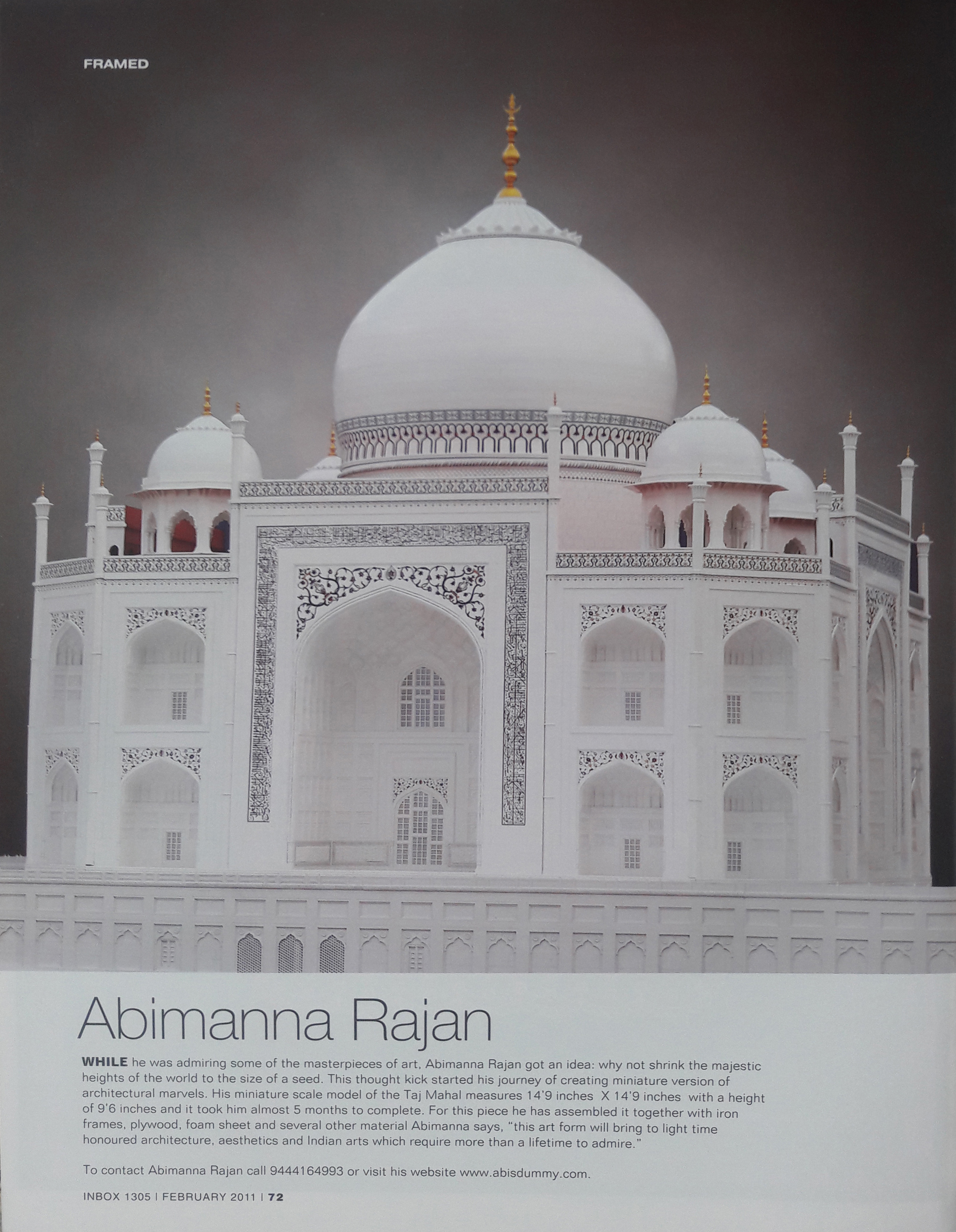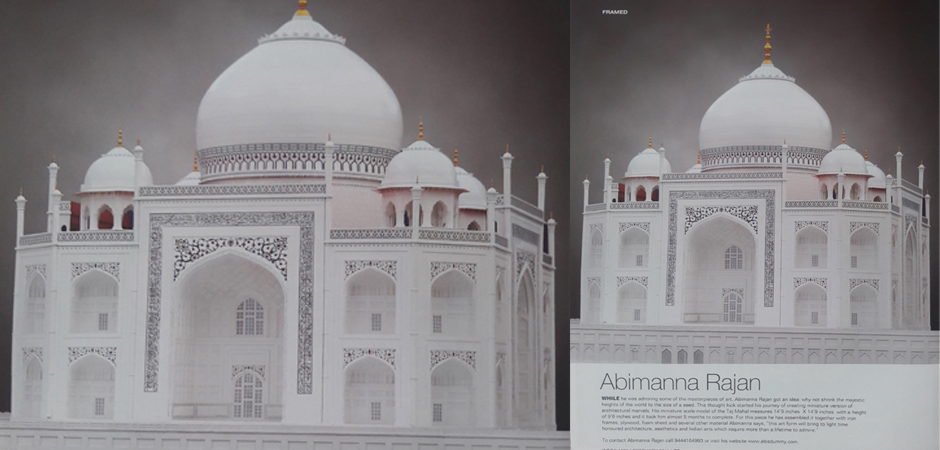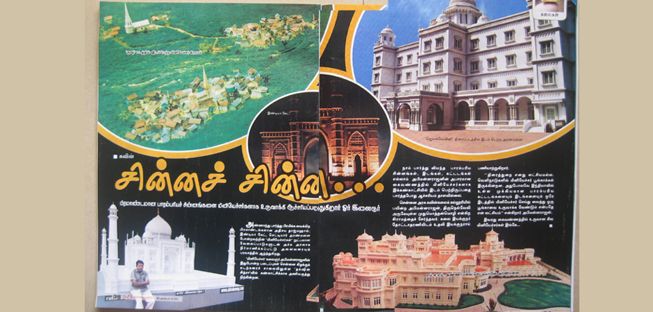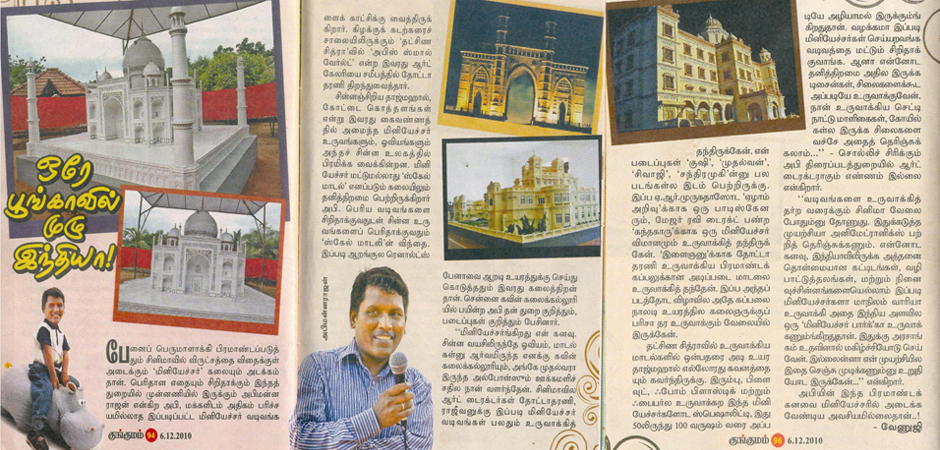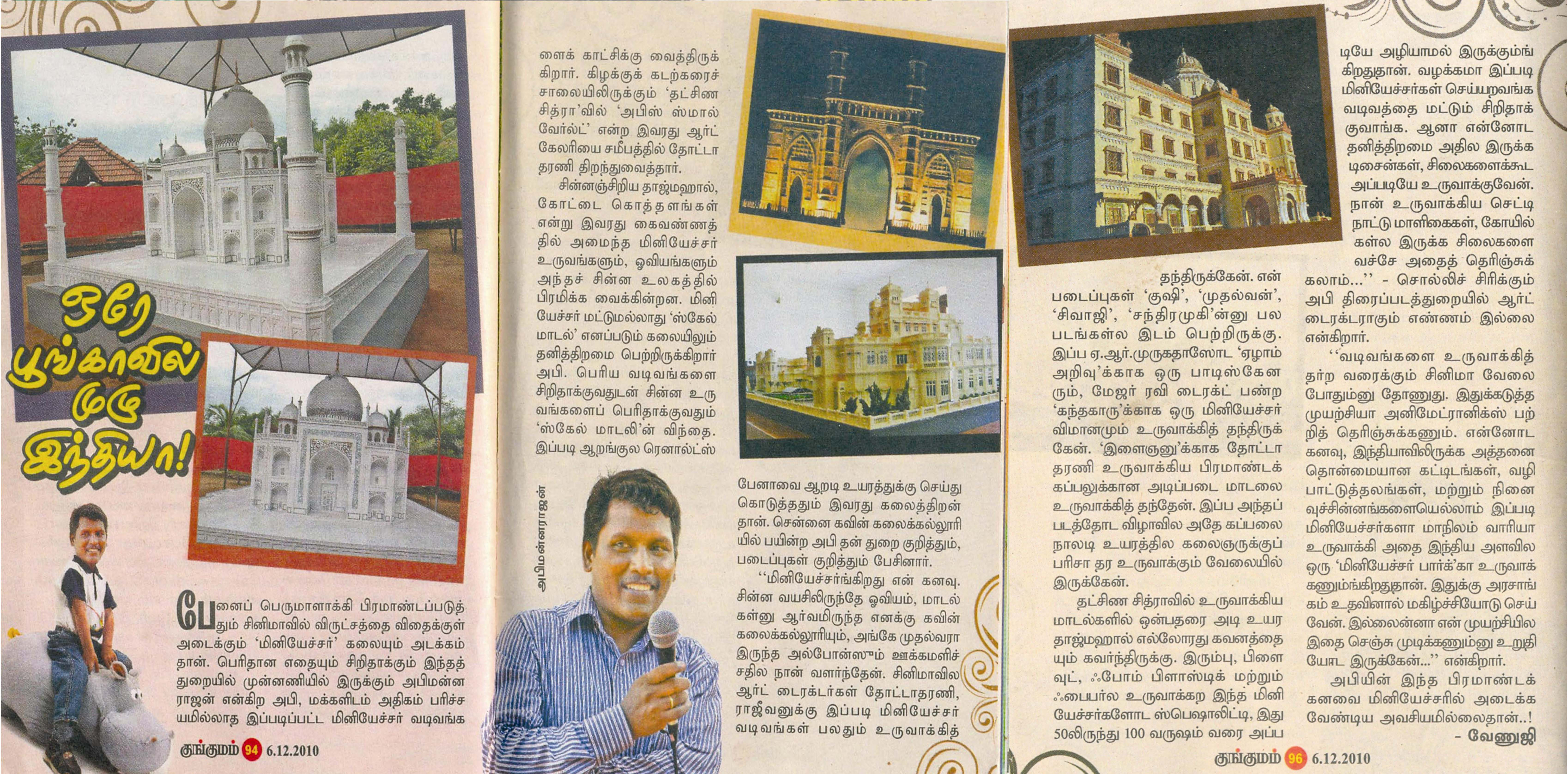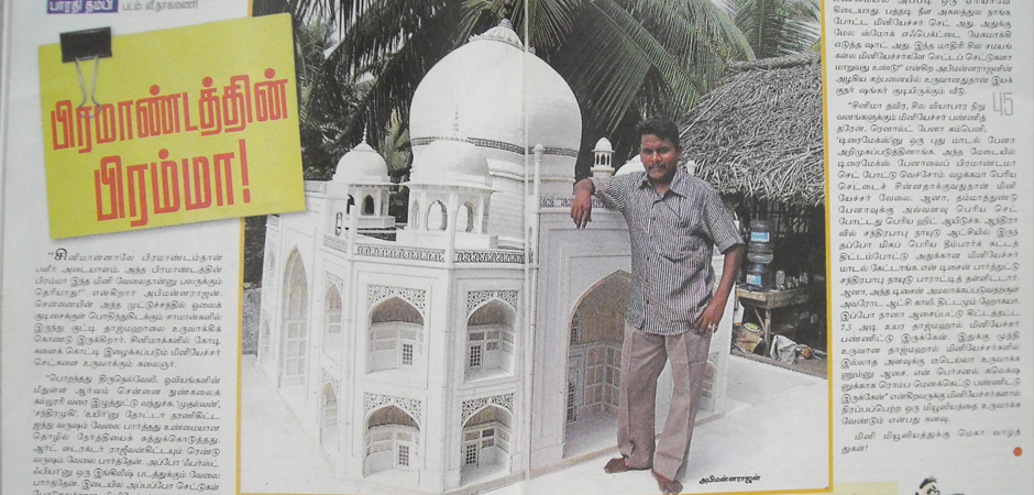பிரமாண்டமான பரம்பரியச் சின்னங்களை மினியேச்சர்களாக உருவாக்கி ஆச்சர்யப்படுத்துகிறார் ஓர் இளைஞர் அண்ணார்ந்து பார்த்து பிரம்மிக்க வைக்கிற பிரம்மாண்டங்களான அதிசய தாஜ்மஹால், இந்தியா கேட் , செட்டியார் அரண்மனை போன்றவற்றின் 'மினியேச்சர் ' நுட்பமான வேலைப்பாடுகளுடன் அச்சு அசலாக நிமாணிக்கப்பட்டு அனைவரையும் பரவசத்தில் ஆழத்துகிறது 'மினியேச்சர்' கலைஞர் அபின்னராஜனின் இது போன்ற படைப்புகள் சென்னை கிழக்கு கடற்கரை சாலையில் உள்ள 'தக்ஷின் சித்ரா' கண்காட்சிக்காக அணிவகுத்து நிற்கின்றன.